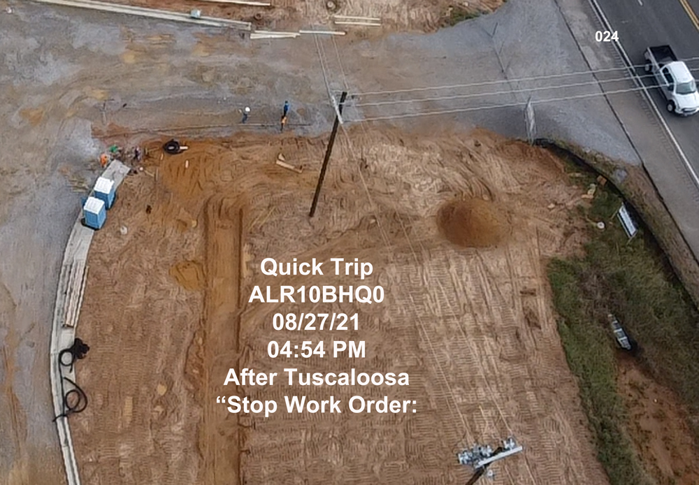 At 11:28 AM, 08/27/21, I photographed Tuscaloosa City officials onsite. By 03:48 PM a “Stop Work Order” was issued. All construction activity except working on BMPs was to cease. At 04:54 I found them still building a concrete form for the front entrance. I notified Tuscaloosa.